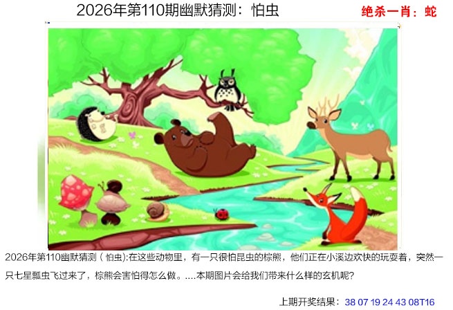 ①第110期图片猜测(怕虫) 在这些动物里,有一只很怕昆虫的棕熊,他们正在小溪边欢快的玩耍着,突然一只七星瓢虫飞过来了,棕熊会害怕得怎么做。..本期图片会给我们带来什么样的玄机呢? 解:怕虫解虫肖蛇龙 ②第110期视频猜测(水果汽车) 森林里,小动物们都搬着大大的水果,它们在比谁的水果好。这时候小鸡仔们开车苹果汽车来了,其他的小动物们都羡慕坏了,纷纷学着小鸡仔们做着水果汽车。不一会水果汽车就做好了,它们开车自己做的水果汽车唱着歌走向森林深处。.. ....本期视频会给我们带来什么样的玄机呢? 解:水果解菜肖猴猪鸡鼠 ================================= 幽默猜测综合取肖:龙蛇猴猪鸡鼠马 本期猜测看好特码:15.02.47.32.22.07.37 |